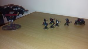 One useful trick is to load up the Corvus Blackstar with a Kill Team containing Veterans, a Biker and a Vanguard Veteran. Using the rules for deploying from a vehicle and the different move values of the unit, you can deploy the unit quite far from the Corvus Blackstar. For example, you can deploy the Biker within 3″ of the flyer and then move 14″, taking you 17″ from the Flyer. You can use the long base size of the Biker and the increased movement of the Vanguard Veteran to maintain coherency with the Deathwatch Veterans. If you deploy the Corvus Blackstar at the edge of you deployment zone, this allows the unit to move up to 17″ in the first turn. If your opponent has deployed near the edge of their deployment zone, this can give you a charge move of between 1-7″ depending on the deployment zone being used.