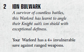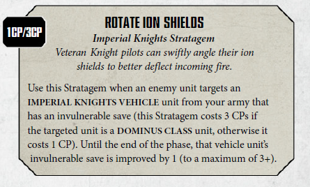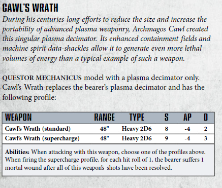 The other parts of what makes the Castellan such a good unit are relevant House Stratagems and Relics. Particularly House Raven and the Questor Mechanicus rules. If you want to run the Castellan at it’s most effective than you’ll want to run it as House Raven. The biggest weakness of the Castellan is how random many of its weapons are. The random number of shots, big swings in potential damage per hit, hitting on 3s. All of that can be mitigated through a single 2cp Stratagem. The House Raven strat, when used on the Castellan, allows it to re-roll all rolls of 1 in the shooting phase. The number of shots, to hit, to wound, amount of damage, it’s even been ruled in most cases that a roll of 1 or 2 on a d3 can be re-rolled via this strat. Not just the roll of a 1. When you couple this with the Mechanics Plasma Decimator Relic, Cawl’s Wrath, you get an even more potent weapon platform. Another weakness of the Castellan is how big of a target it is for the enemy. Again, there is a good stratagem combo that works here. You can purchase a Warlord Trait for the Castellan, even if it isn’t a Warlord, and give it a 4+ Invulnerable save against shooting attacks, you can then use a Strat, Rotate Ion Shields, for 3cp to make it a 3++ against shooting attacks for that turn! Even if your opponent damages the Castellan and degrades it, you can still fight at full next turn. As long as you’re Mechanicus aligned, but you’re taking House Raven so that’s not a problem!