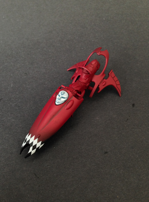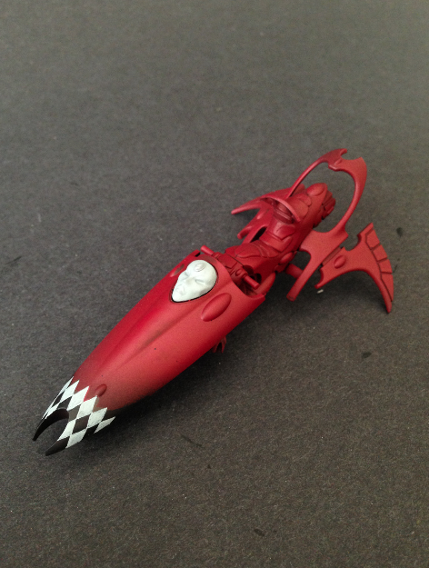 To finish it up I apply the same painting progress as I detailed in my in-depth Venom painting tutorial. It is a simple progression of Mephiston, to Evil Sunz, to Wild Rider capped off with just a touch of Cadian Fleshtone on the most extreme points and angles. I also did a 1/2 & 1/2 blend of Mephiston and Khorne Red on the raised area of the bikes fuselage.