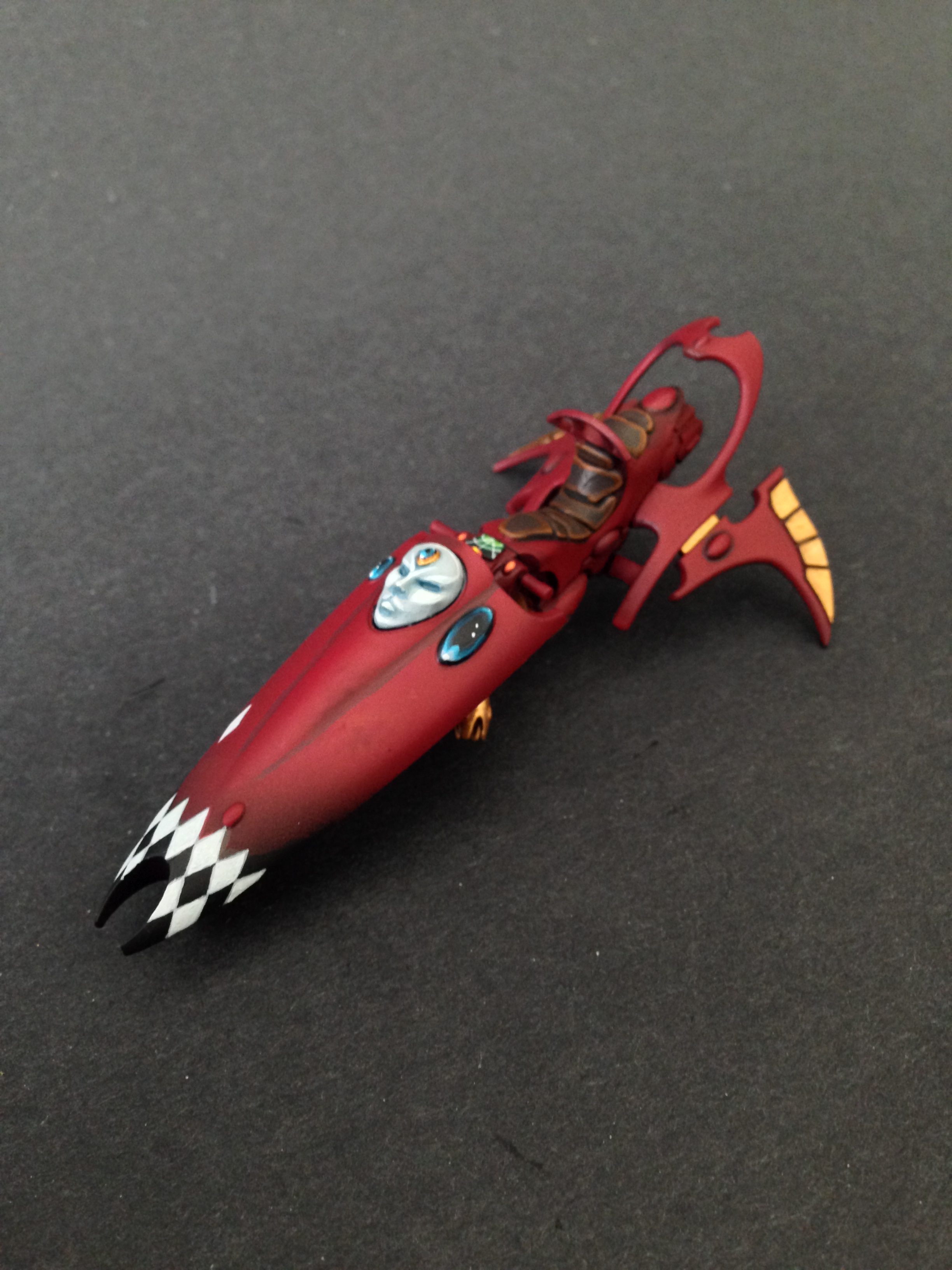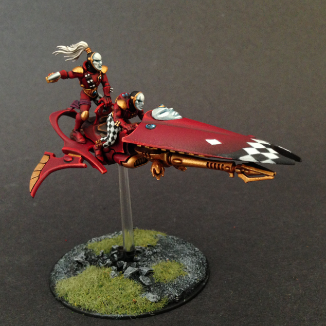 This next step was the most crucial. I didn’t want the diamonds to dominate the bike, as I want the overall Y’nnari color scheme to match-in with the rest of my army. Furthermore the riders will also have diamond, so I can still get a very checkered look without overwhelming the sleek stylings of this amazing sculpt.