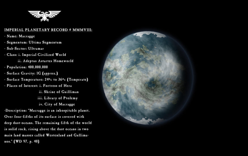 Macragge would continue to be an important world in the years following the Heresy. Guilliman became the Lord Commander of the Imperium, and set to the task of rebuilding the broken empire left in the wake of Horus’ treachery and demise. This goal would eventually be cut short, as an encounter with Fulgrim would leave him poisoned nigh unto death. Unable to cure him of the wound, he was put into stasis and brought back to Macragge. Set almost as a living idol, it would be ten thousand years before his hand would shape the fate of mankind. Even so, his sons the Ultramarines would continue his legacy, with the Fortress of Hera and Macragge at the heart of their efforts.
