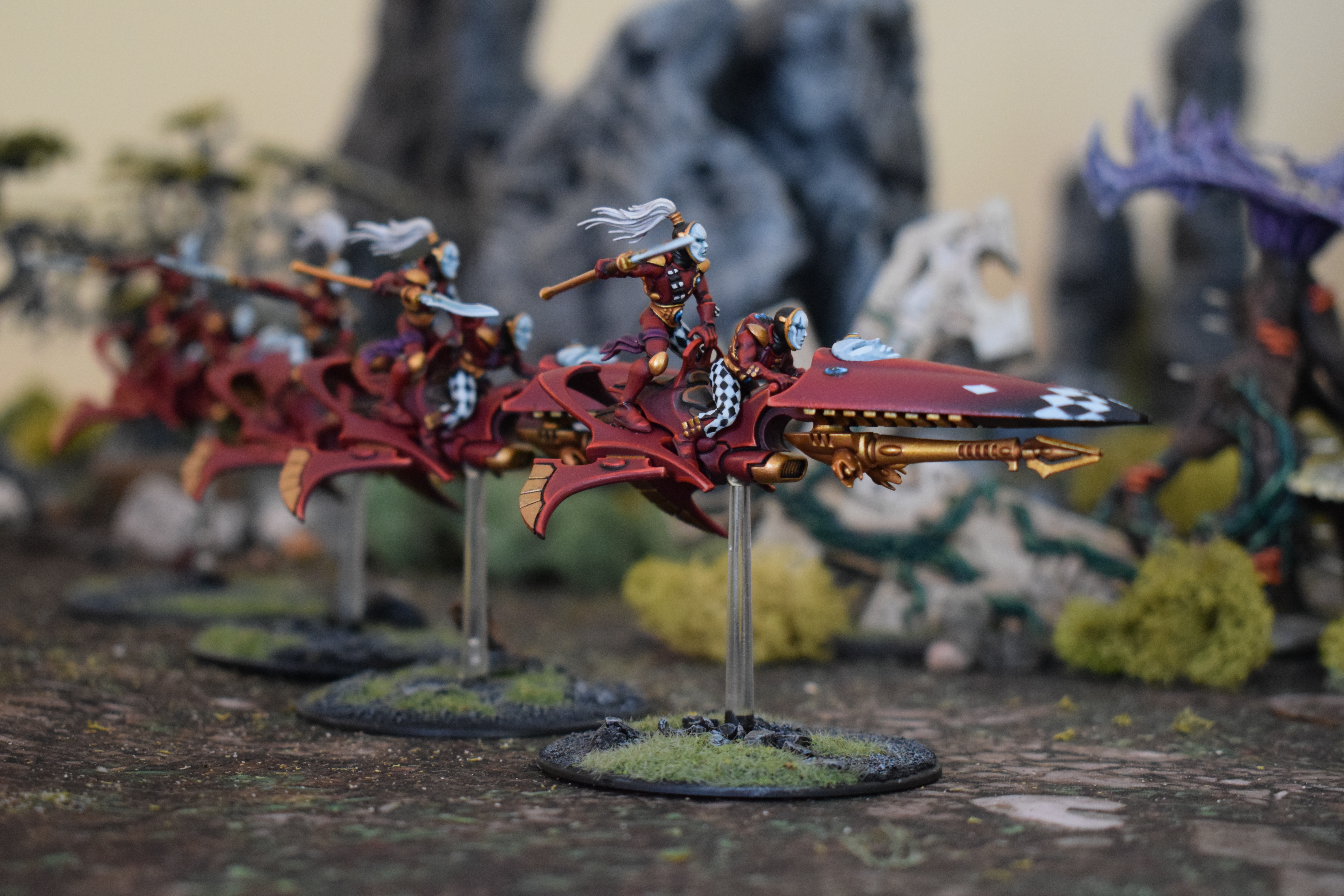 Often overlooked, Saim-Hann Shining Spears are a very reliable alternative to their Y’nnari counterparts. The Craftworld specific Stratagem allows them to assault after advancing (and are re-rolling 1’s in combat), meaning they can move 22″ on their own and still assault. A nearby Warlock casting Quicken will allow them to move again, meaning yet a total 36″ movement all before assaulting. A nearby Farseer perhaps using Executioner and Smite can also clear screens allowing Saim-Hann jetbikes a path towards the most choice targets before Quicken. Also worth noting Y’nnari Shining Spears and Saim-Hann Shining Spears could work really nicely together as well, with the Saim-Hann bikes hitting the frontlines with a simple move and advance, while the Y’nnari bikers get the whole suite of psychic buffs boosting them into the heart of the opponents force.