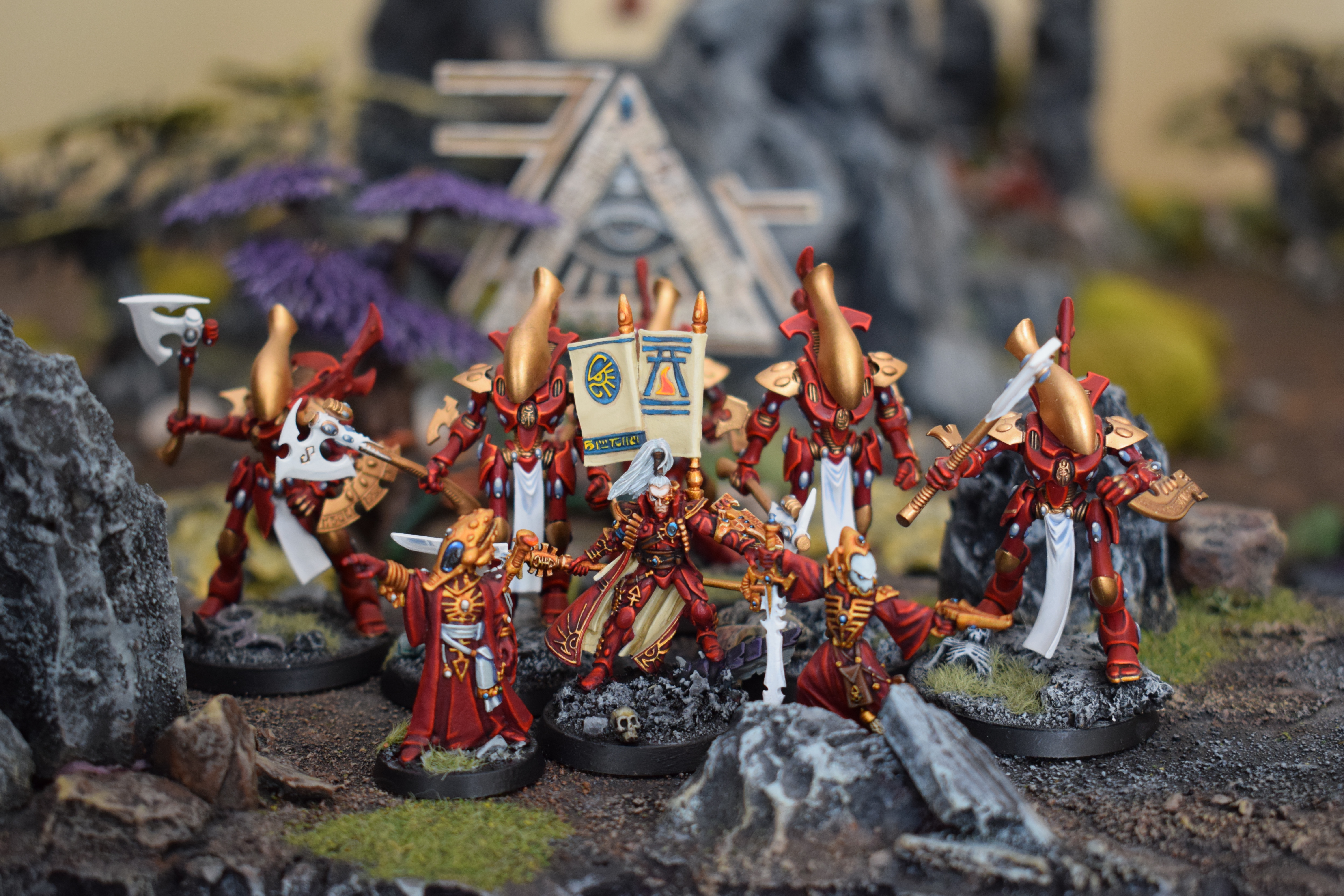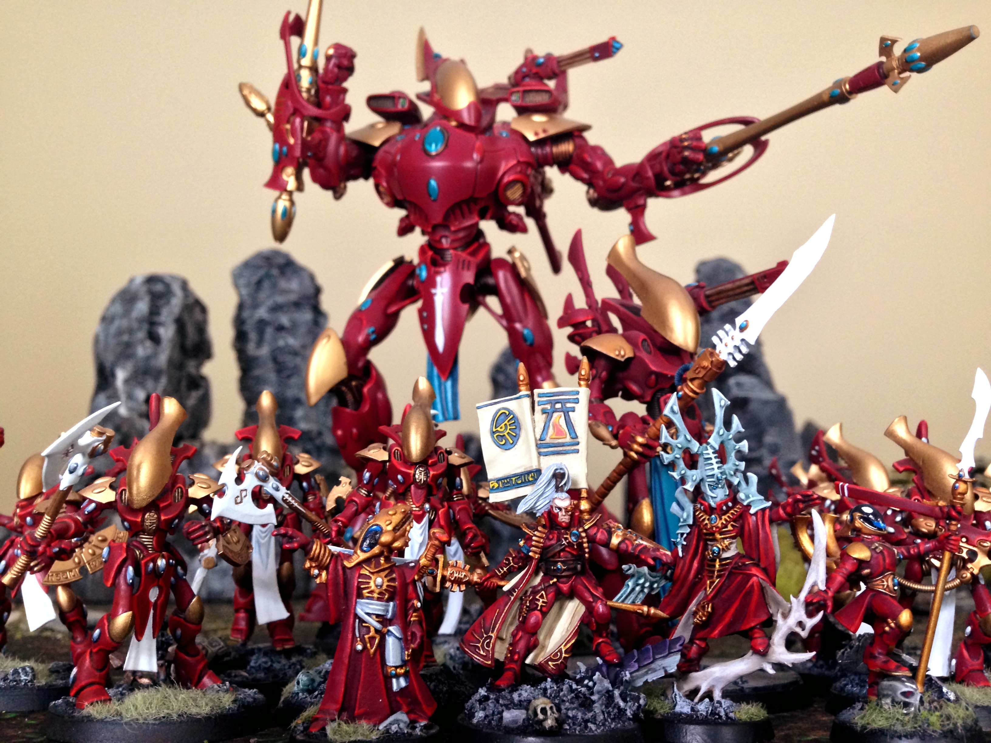 For example instead of going all out like in the photo above, to me you could represent a very strongly thematic Iyanden army taking a single unit of Wraithblades with shields + axes, stick them in a Serpent with Spirit Stones, Prince Y’riel and Spirit Seer with Protect/Jinx, the Pystronome of Iyanden and a Farseer on Jetbike trailing behind to cast Fortune on them. This unit considered very poor by most people is now a legitimate threat (30 attacks, re-rolling ones, at Str 7 D3 Dmg AP-4, 2+/4++ saving throw with a 5+ feel no pain) that takes skill, experience and dedication to running. Then the rest of the army can be filled out by more stock paths to Eldar victory by say taking some big units of Guardians (yes Iyanden does have a healthy supply of Guardians see the Valedor Apocalypse book from 7th edition for details) to take advantage of their excellent morale control and infantry shredding abilities via a webway bomb, some nasty Hemlocks who were practically invented on Iyanden (see the 6th ed. Iyanden supplement). If you’ve got points you could ally in some of Y’riel’s Harlequin buddies (Veiled Path perhaps who led Y’riel to the Spear of Twilight) you have a very thematic army but one that can compete in any local scene.