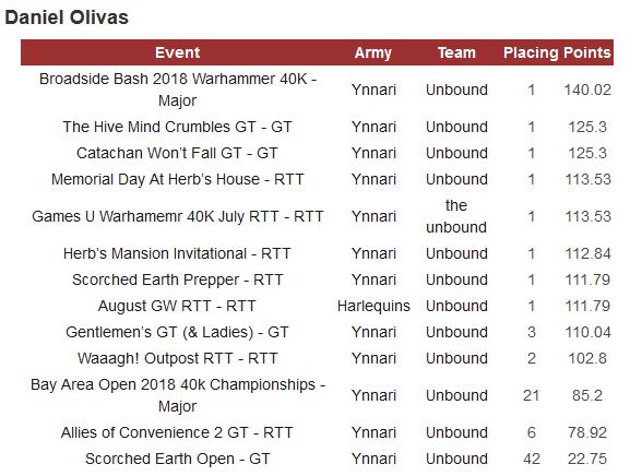 - Daniel has a lot of 1st place finishes under his belt and he’s been representing Ynnari in a big way! Another player within 5 spots of the top 10 and a solid chance to get to a bump up before LVO and playing a great army well. That’s a potent combination. Similar to Custodes the Aeldari got a big boost from the FAQ nerf to Knights, and they were unaffected by the nerf to CP farms, meaning they got a decent boost back up the tier ladder. I think Daniel stands a good chance of winning it all this weekend.
