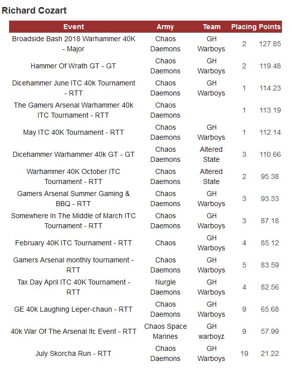 - Richard is overdue for a GT or Major win in my opinion. He’s been using Chaos to great effect and I am a particularly large fan of the Chaos Daemons list he’s been using well. He came in second at the Hammer of Wrath GT, drawing in the final round at the top table with my first Dark Horse pick. Richard is a great player who has been putting in the time necessary to really excel at this game. You can’t count him out this weekend.