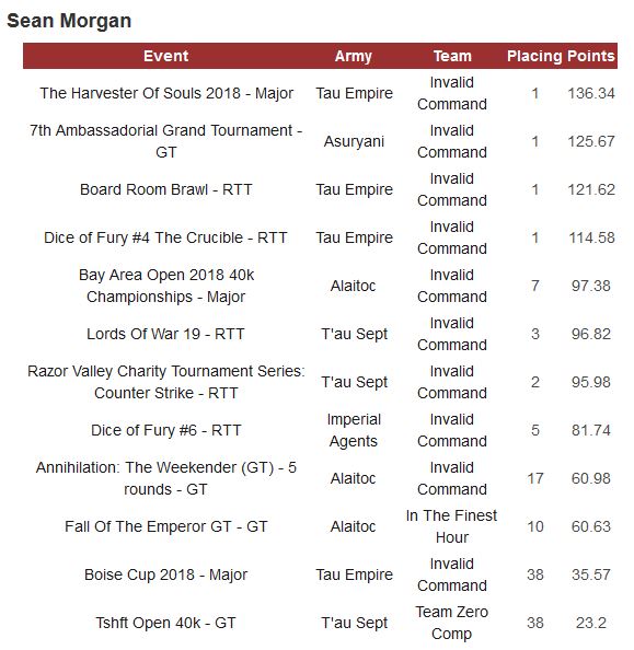 - Sean is going to be representing the Tau at So Cal Open, according to the list he has uploaded to the Best Coast Pairings App. Sean has had a good season this year, playing Tau or Aeldari throughout. He has a few first place RTT finishes with Tau and a first place at the Harvester of Souls Major playing Tau. It is important to note that the Harvester of Souls didn’t use the ITC Missions, and it’s likely he did well at the event because Tau had a better shot in that format. None the less, you can’t write Sean and his Tau off at So Cal Open. You don’t get to the top 40 in the ITC this late in the season if you don’t have the skill, it isn’t all the list after all.