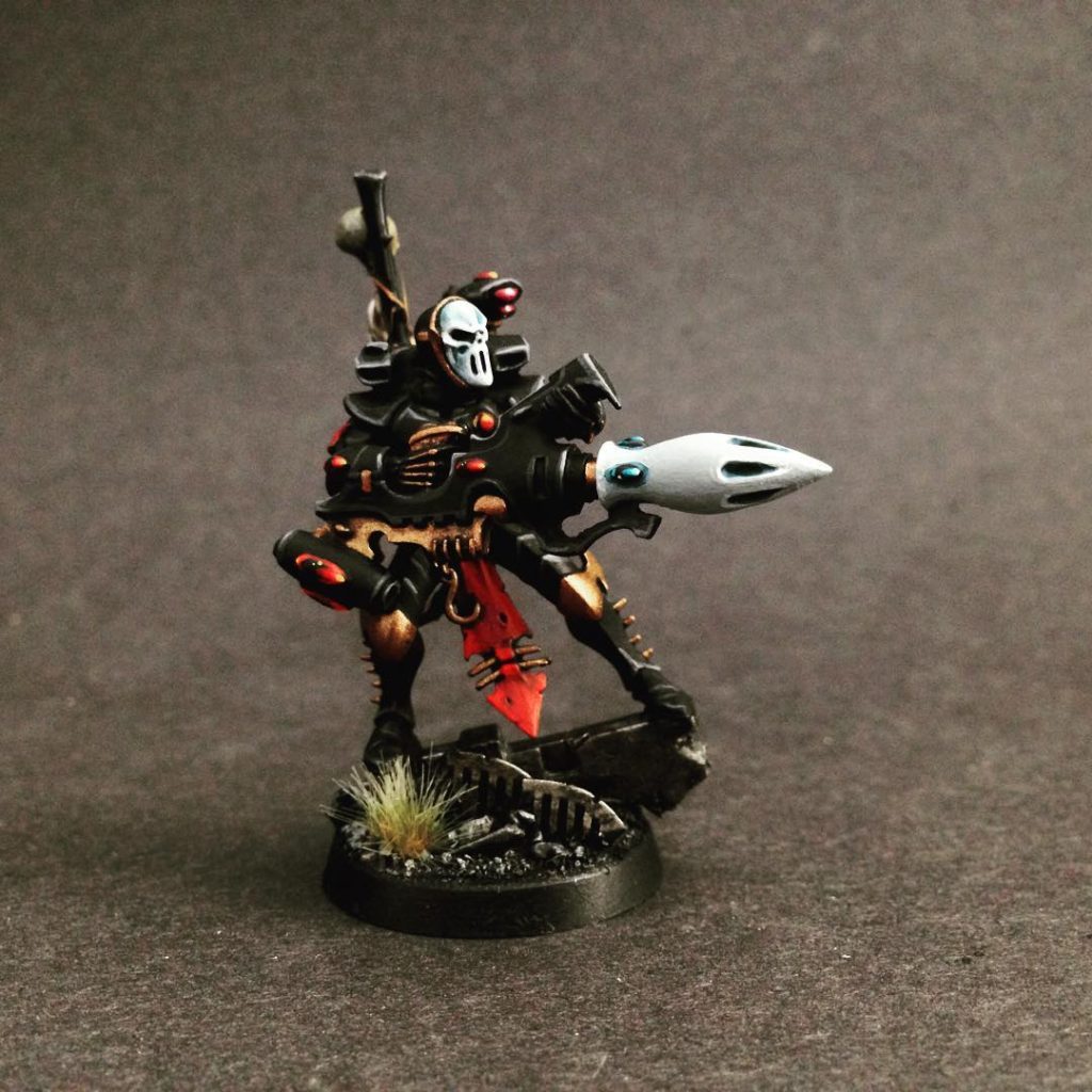Quick painting tutorial is a simple Eshin Grey, Dawn Stone highlight on the black armor with a little bit of blending here and there. For the mask and muzzel of the missile launcher I painted Celestra Grey with Ulthuan Grey highlights. The gems are Khorne Red, Mephiston, Evil Sunz, Wild Rider and Fire Dragon Bright. While the teal gems are Sotek, Temple Guard, Bahharoth Blue. The lens on the Reaper Range finder is Screamer Pink, Pink Horror and Emperor’s Children.