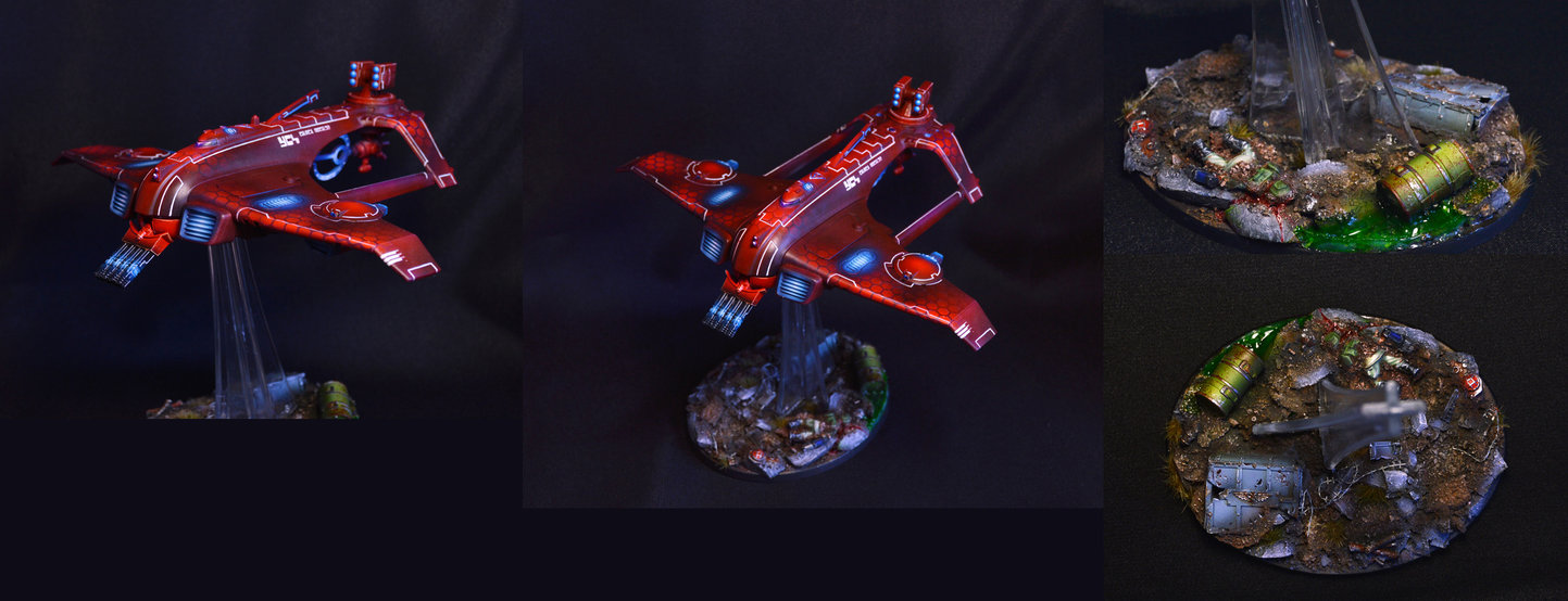 Like most all flyers, the Sun Shark has the Airborne, Supersonic, and Hard to Hit rules, meaning that it can only turn ninety degrees before moving in a straight line as well as being unable to assault (or be assaulted by anything other than Fly units.) Enemies also take a flat -1 to hit it with any attack in made in the shooting phase. Finally, if destroyed, it can crash for d3 mortal wounds to nearby units.