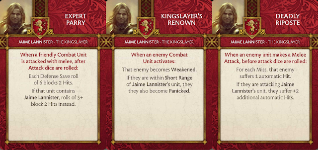 When it comes to units, you really want units that jive with your commander. You want to be able to amplify the Commanders’ strengths rather than mitigate their weaknesses IMO. There’s a couple of reasons for this but the biggest one is that there are units in the game that will play very nicely with your Commander’s tactics cards and if you have units that don’t utilize these tactics cards, you won’t be able to use them as effectively. That’s what I recommend doing first, and that’s finding units that play well with your Commanders overall battleplan and takes advantage of their tactics cards. For example, if you take a unit like the Lannister Guards above who already have an excellent 3+ defense save and pair them up with Jaimie’s tactics cards, not only will you have a unit that will be even more difficult to take down, but you will also get tactics cards that allows you to parry/riposte and make up for that lower damage curve (6/5/3).