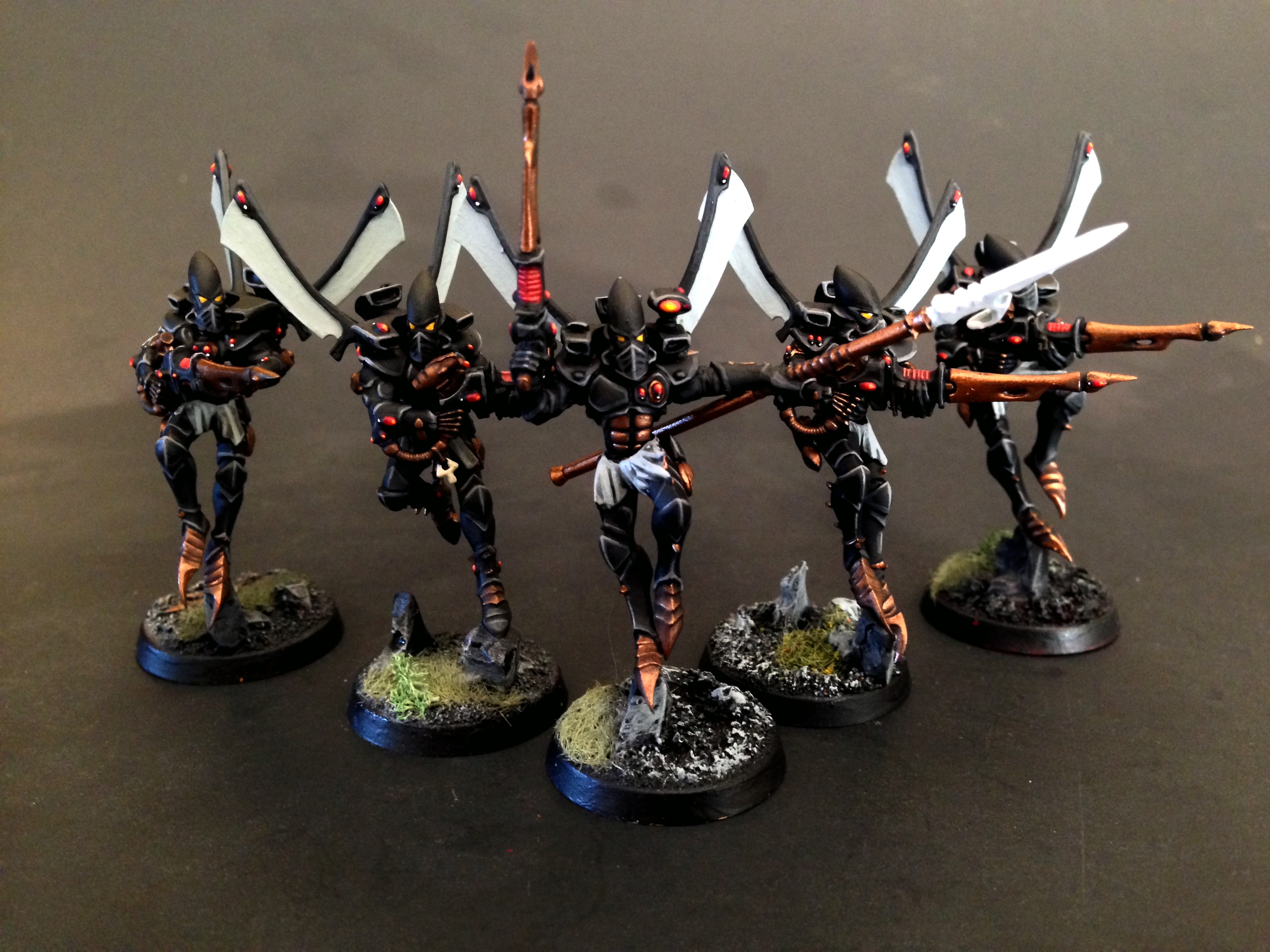 I turned my skyreavers into Dire Avengers. I removed their pistols and melee weapons that I ran on them in 7th and put regular shuriken catapults on them. They have different heads than my standard guardians and the wings on the back kind of fill in for the big hats the dire avengers wear.