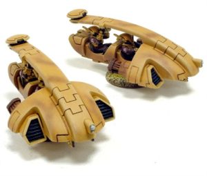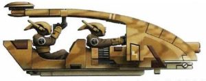 Piloted by two T’au Pathfinders, the Tetra excels in highly-mobile recon-gathering and forward scouting missions. Like the pathfinders that pilot it, the Tetra is not armed for direct engagements, but rather well suited for supporting other T’au forces through the use of its high-intensity markerlights. What’s a high-intensity markerlight, you ask? Apparently a super-duper laser pointer, this baby has “drone-controlled gyros” and can emit longer-lasting beams of light so that more salvos of T’au firepower can be unleashed with a single hit that the regular, old markerlights. On the battlefield, they are often seen in squadrons (probably due to their relative fragility and redundancy’s sake) supporting the core of the T’au Empire’s forces for that engagement. They can directly engage the enemy but with so few armaments, most try and avoid it.