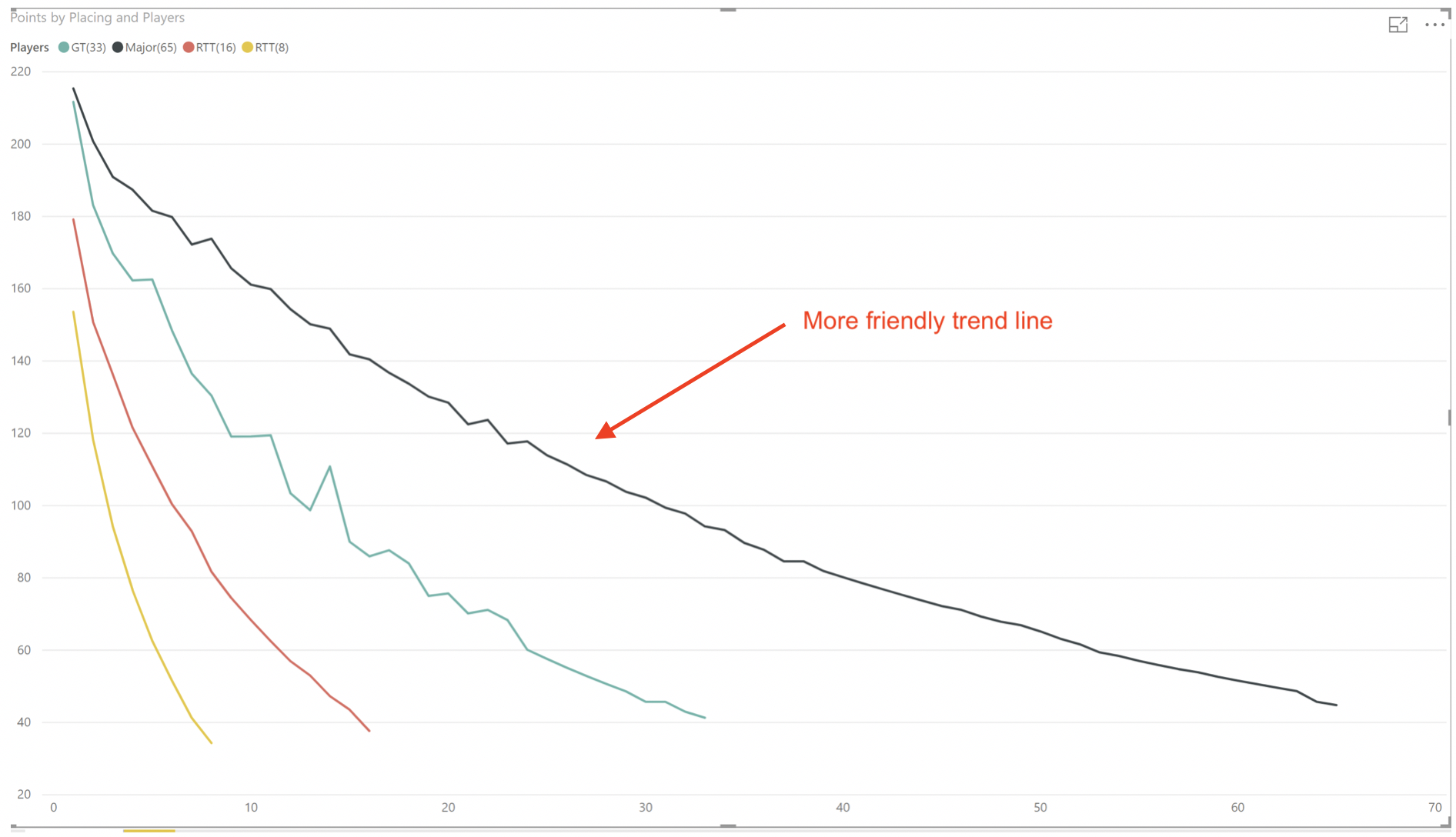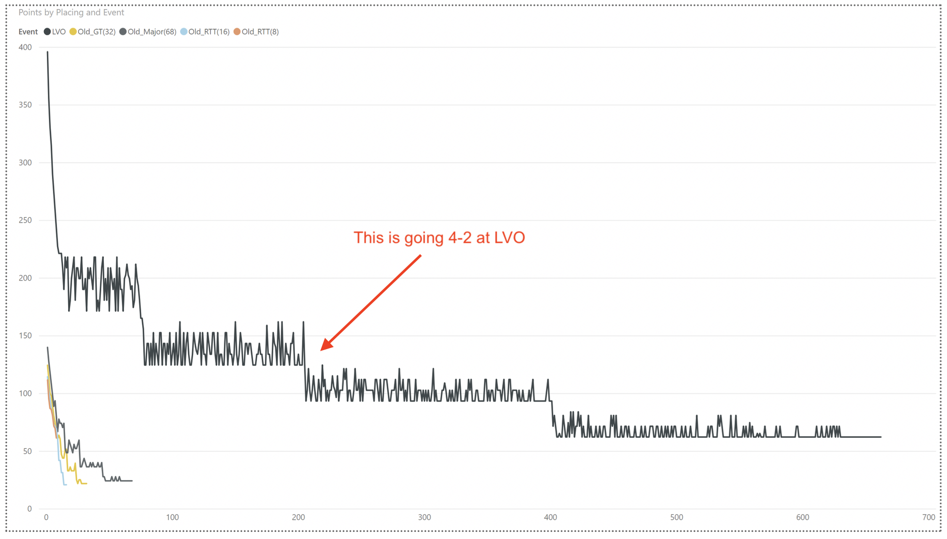 The new formula is very different in its incentives after about 30 people, it kind of stops mattering how many people are in the event as long as you place high. If you’re in a larger event, you have more leeway and can get away with 3rd or 4th and still get a high score. The real huge change is in the 5th through 10th rankings. It’s a little tough to tell but 10th place at a major gets more points than winning an RTT. Compare this to the old formula where getting a 10th place finish at a major could actually get you LESS points than LAST place at an RTT. With the new formula, even though more points are awarded at RTTs in regards to first place. [Not sure where the previous sentence was going, but just sort’ve stopped] I have a feeling we will see them drop out of importance in a big way as people get solid finishes at GTs and Majors for more points than winning a local RTT. Even a 16 person RTT getting you 180 points is now the same as finishing 6th at a major. The part that will make LVO still matter is that you see the line gets more shallow the more people are in it. So while it will still be tons and tons of points, I have a feeling that placing well at GTs will be worth more than just showing up at LVO. There won’t be any more occurrences where 4-2 results at LVO winning factions over someone with a GT win.