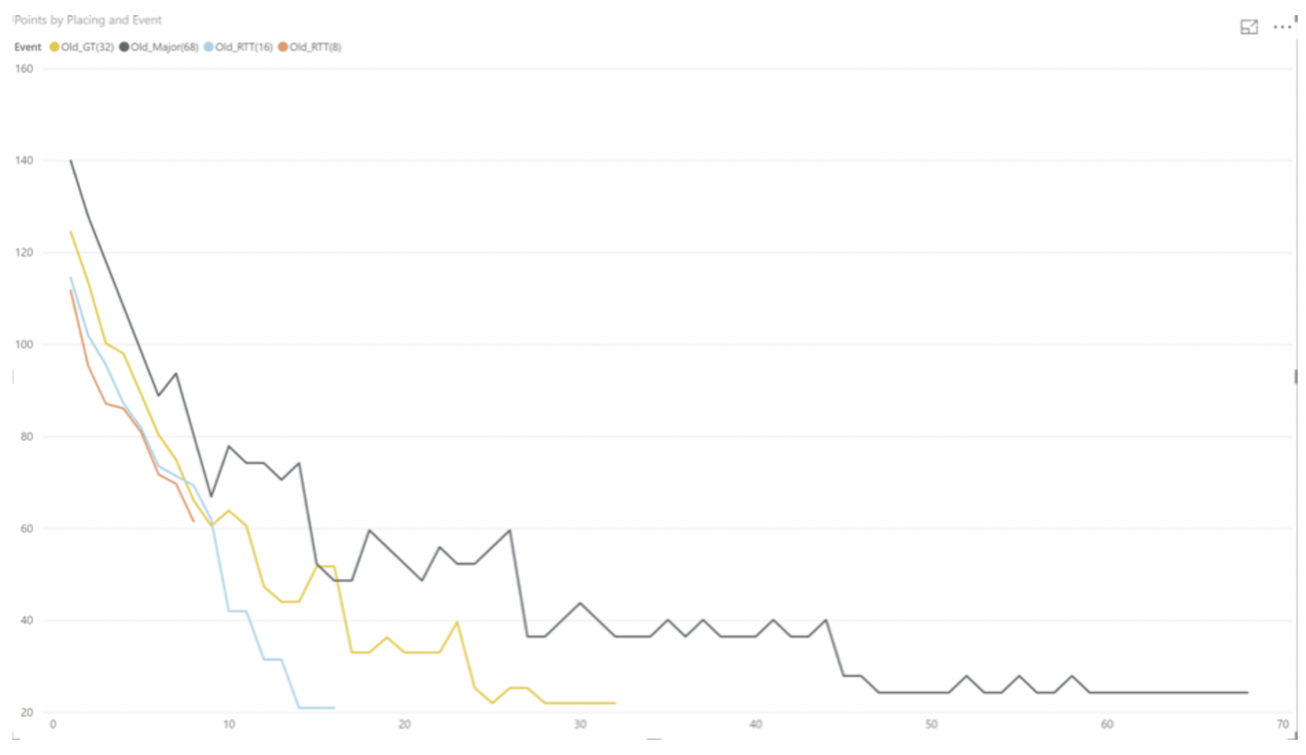 The image below shows us another issue with the old formula. The only way to get points was by winning events. Second and third place got the same or less points than placing first at a small event. There is even a point where getting middle of the pack at a RTT gets more points than solid finish at large events. Essentially the formula penalized losing but didn’t reward winning. So someone who lost twice in a 6 round event got the same score as someone who lost twice in a 3 round event.
