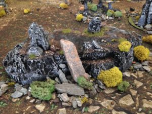 Whether its on the rim of the bases of my own models, the basing for my ruins, the edge of craters, spots of foliage on the hills and mountains everything gets the same treatment. Supplemented with scattered pebbles and lichen (which you can pick up from Michaels) this allows me to pull everything into a single theme.