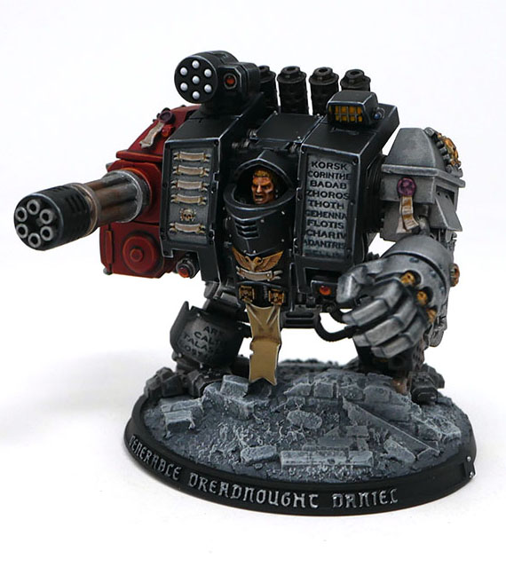 Here’s a highly customized Dreadnought built by our client that he recently painted in a Deathwatch paint scheme.