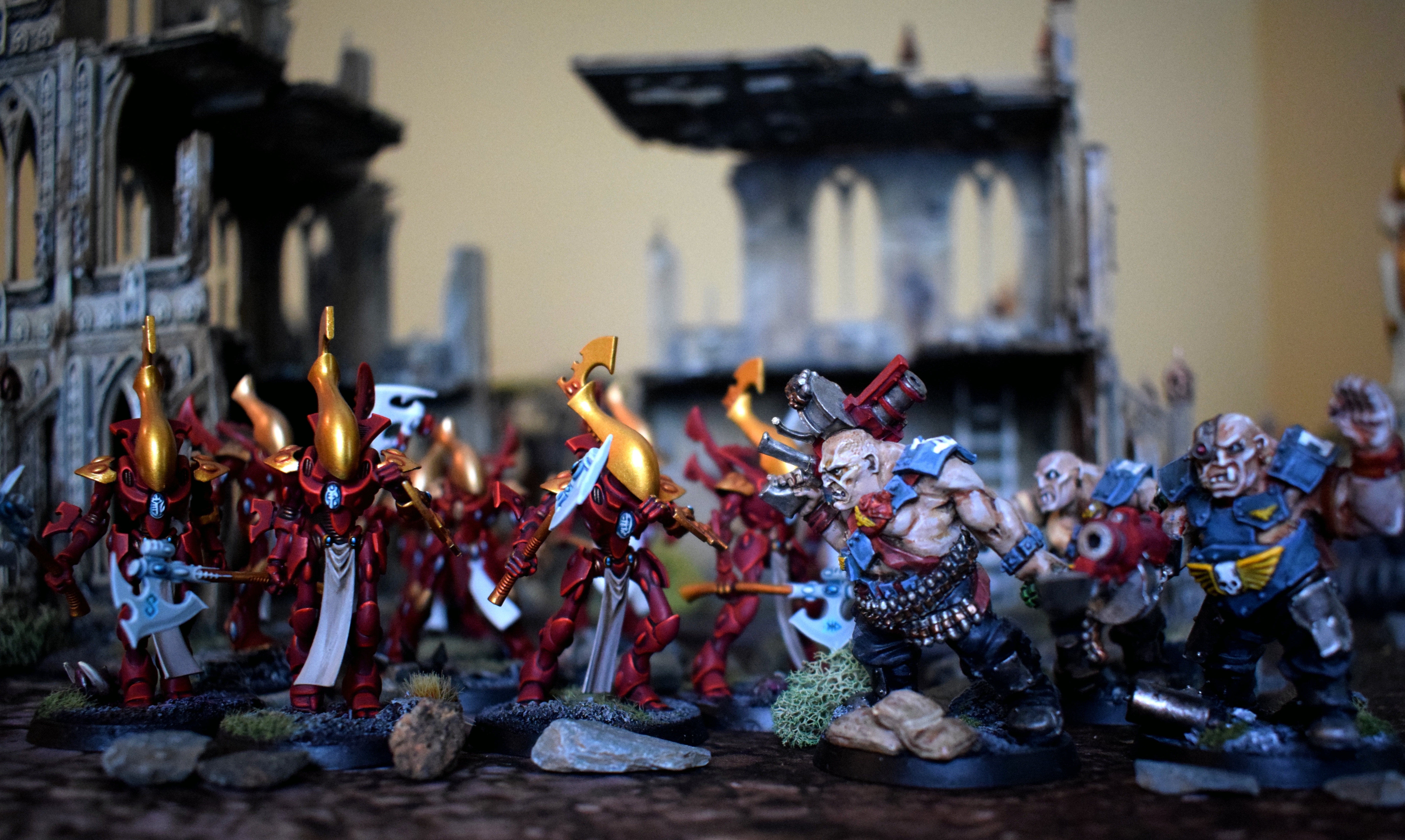 Alaitoc- In an Alaitoc detachment these guys become truly an immovable object. At ranges beyond 12″ they can go all the way up to -3 to hit with a 2+/3++ with a 5+ FNP when powered up with Lightening Fast, Conceal, Fortune and Protect. In this build you are using them primarily as a damage denying tank that can march up the board shrugging off insane amounts of ranged fire power that can also lock horns with a Knights, Daemon Prince, Daemonic Primarchs etc and just serve as an anvil to the hammer of your flyers, Reapers and Shining Spears etc.
