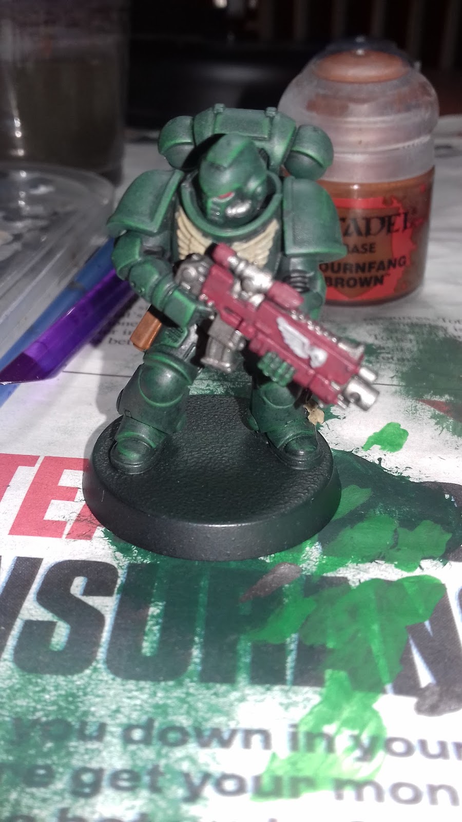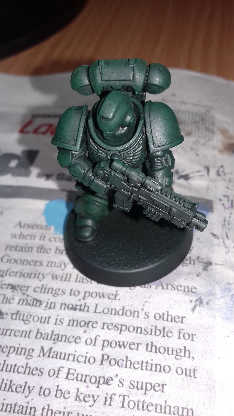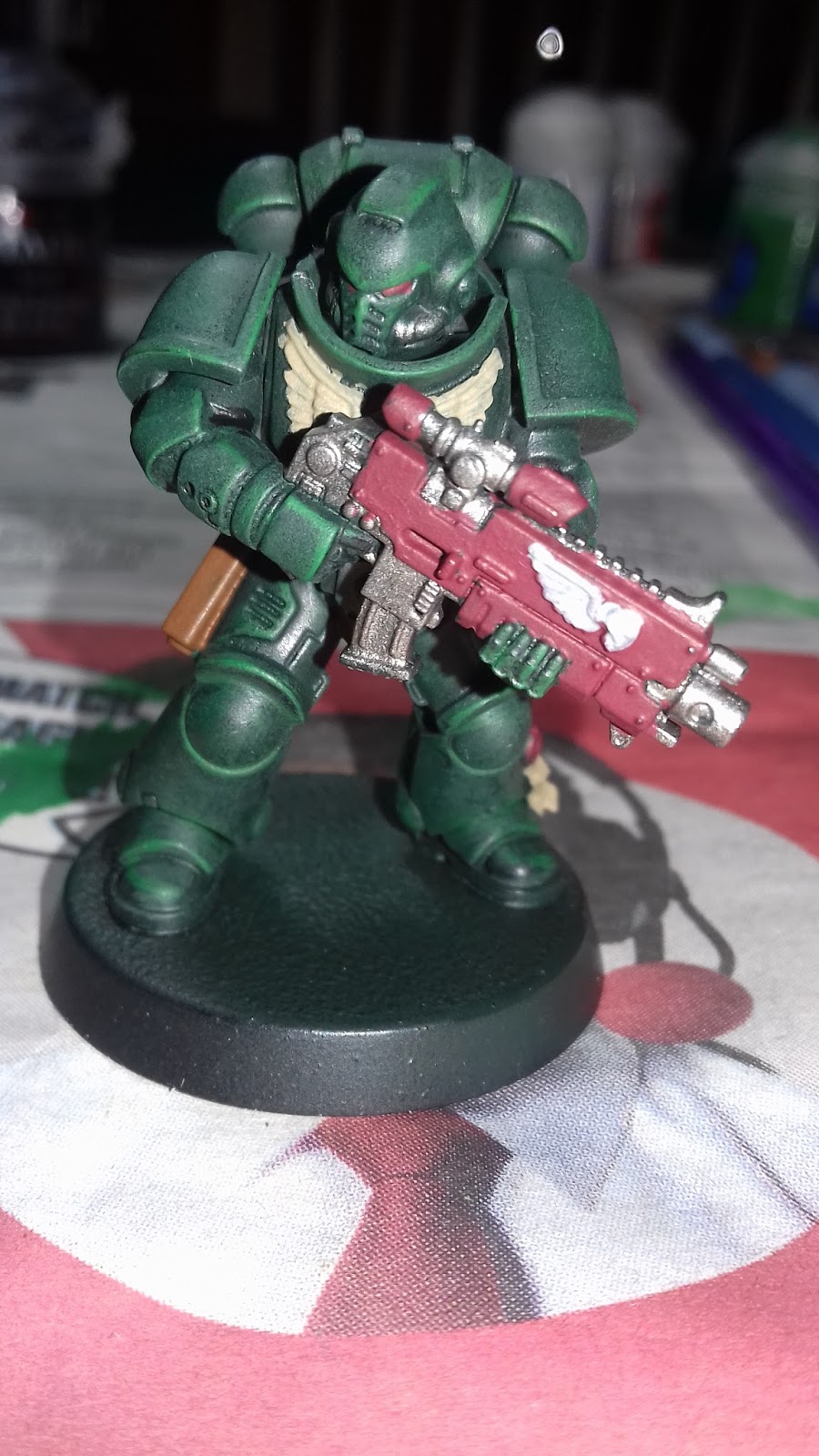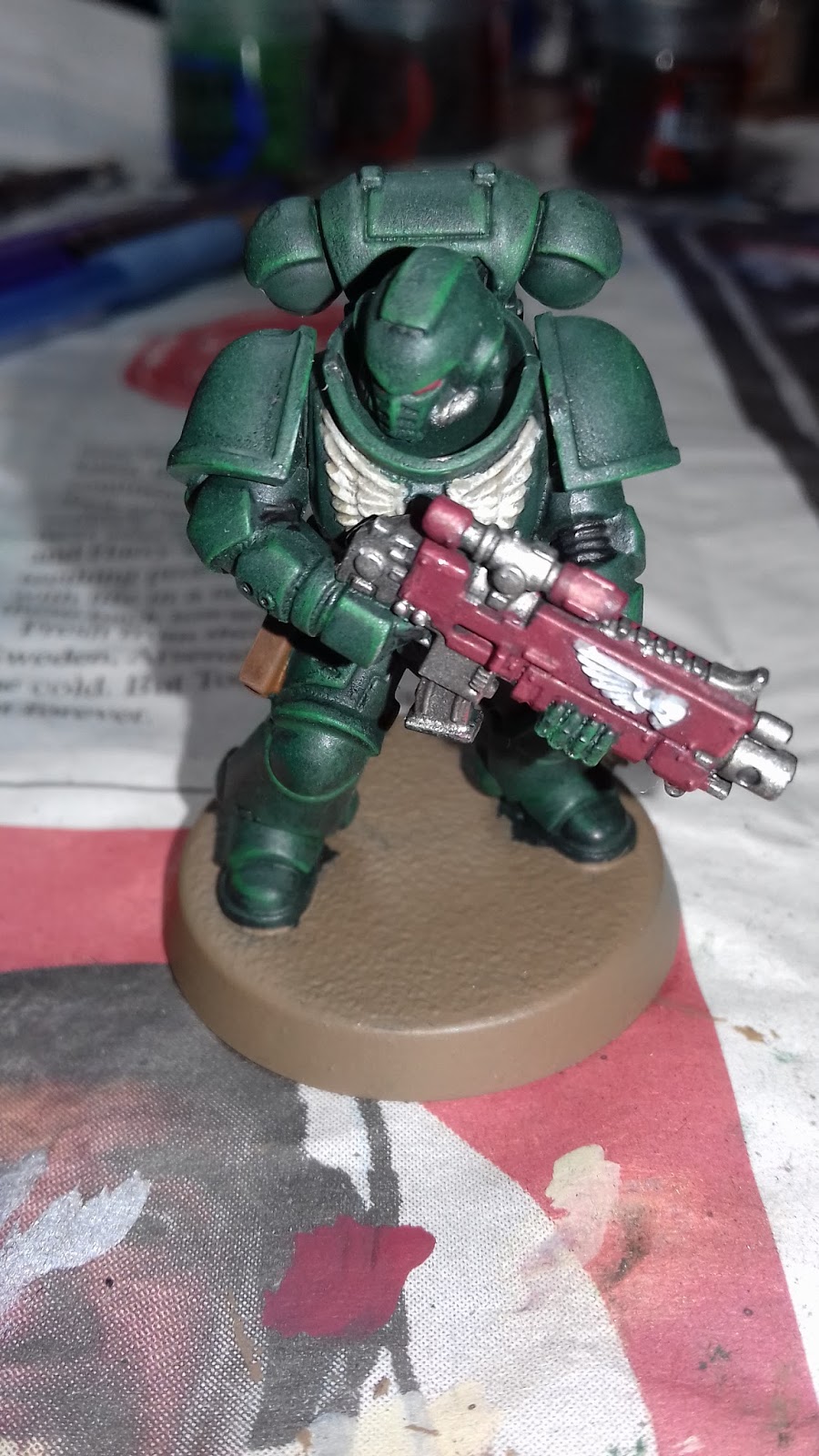 I decided that for my new force, I would try some edge highlighting. I had been doing this with my Deathwatch force with some success, so wanted to apply it to the Dark Angels as well. I based my colour scheme on the awesome Warhammer TV video tutorials, more specifically the Dark Angels Hellblaster and Dark Vengeance Tactical Marine videos.
