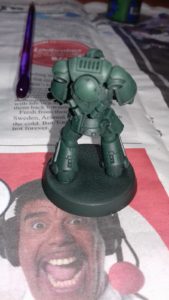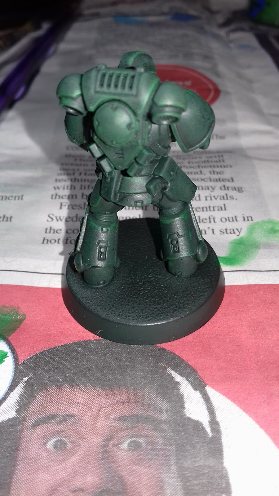 Step 3- Drybrush with Caliban Green. Drybrushing is a process of picking up areas of highlight on a model with ease. You take some paint on your brush and wipe off the excess paint until the brush is almost dry. Then you draw the brush over the raised areas of the model, going back and forth to build up the colour until it is to the level of highlight that you want.