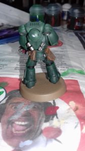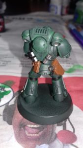 Step 6- with the armour done, it’s time to pick out the details on the model. I tend to fill in all the other colours before applying other washes. The metal areas are painted Leadbelcher, the purity seal waxes and gun casing are painted Khorne Red, the pouches are in Mourfang Brown, the sections between the armour plates are painted in Abaddon Black, the icons on the guns are painted with White Scar and the purity seal tabs and front eagle on the chestplate are in Zhandri Dust.