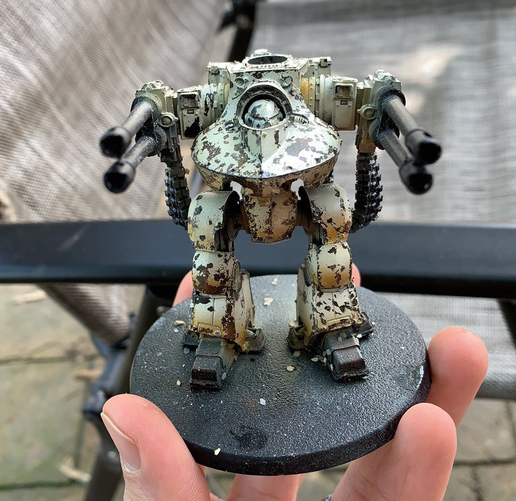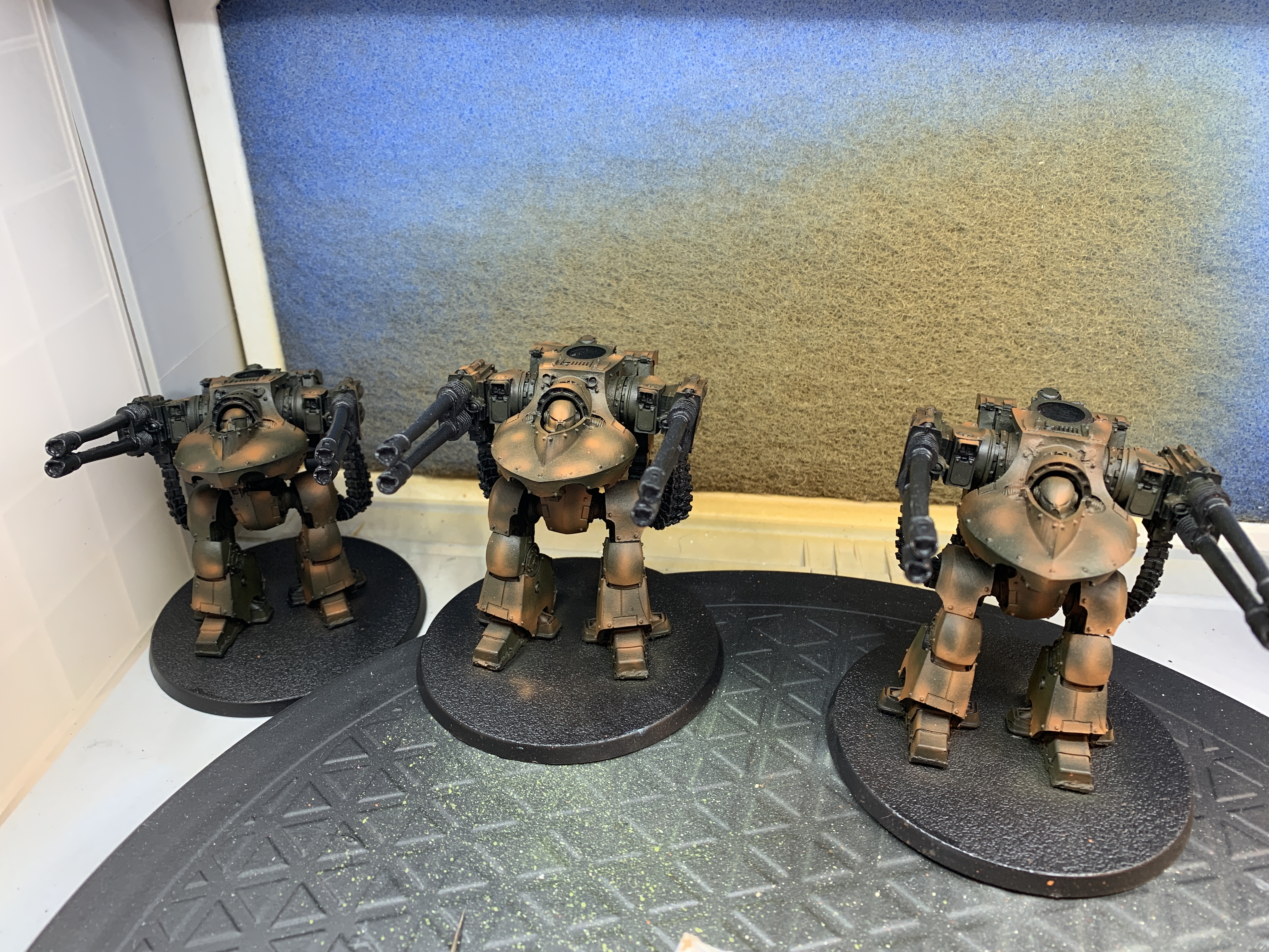 I started off by priming black. This is my preference and it lends itself to the technique. You can substitute any of the colors I mention with whatever you have on hand that’s close. The exact color isn’t important. Next, while using an airbrush, I used Model Air Burnt Umber to cover the entire model. This is a great base for the following browns but it’s kind of hard to see over my Rustoleum Black primer so it can be a bit tricky to not flood the model with too much paint. As is almost always the case with an airbrush, you want multiple thin coats. Next, I starting picking out spots where I imagined water and rust to accumulate – the feet and bottoms of panels, in cracks, etc. In these spots, I used Mournfang brown to build up a lighter brown before using Skrag brown, which is getting on the verge of dark orange, to make these areas varied and brighter. You can see below what I ended up with. You want varied, non-uniform coloration.