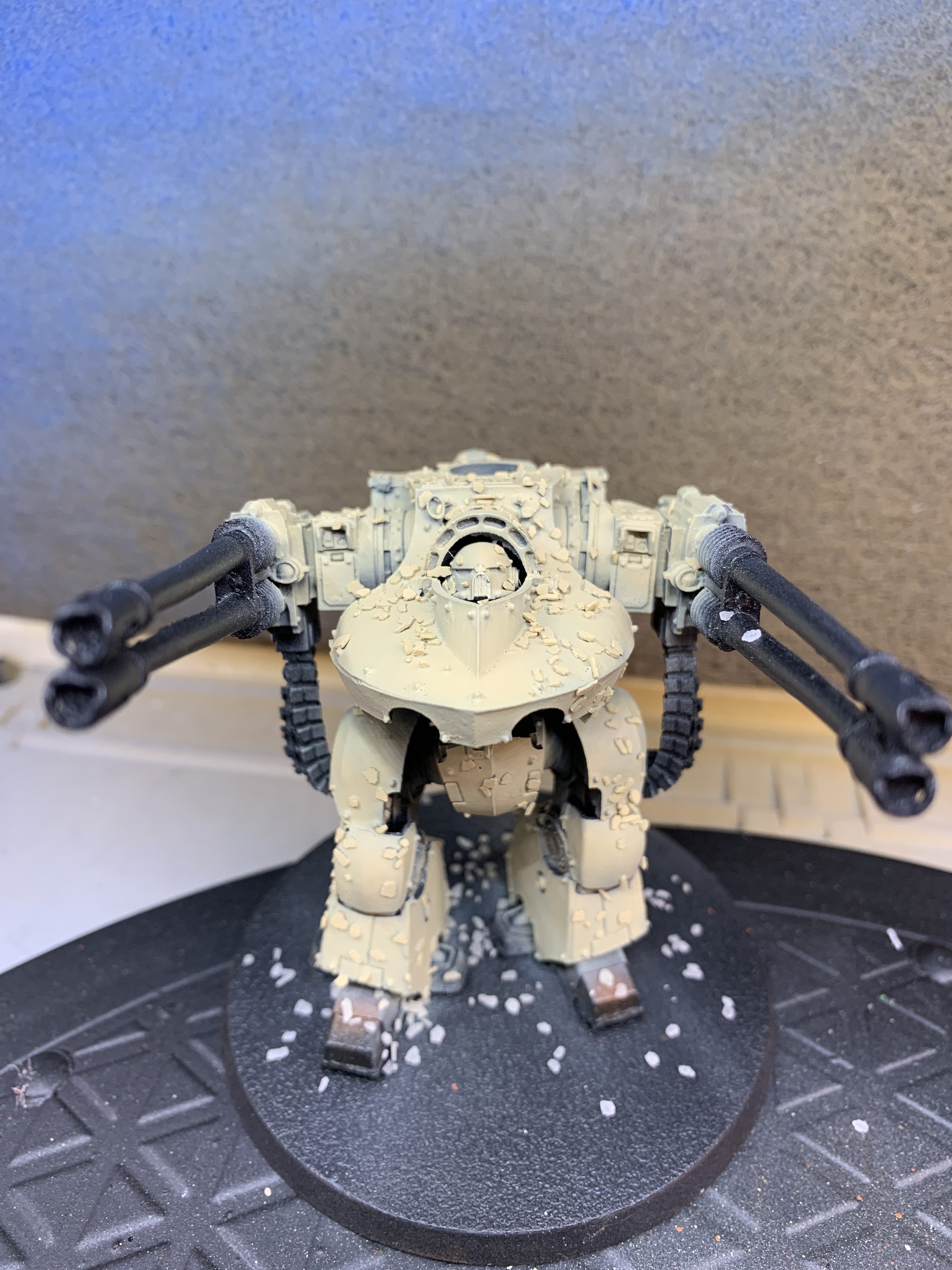 The gradient wasn’t very apparent so at this point I used the DR ink (burnt umber) to spray upwards, hitting the bottom and underneath of many panels, even into some of the crevices. This is basically the opposite of highlighting – you’re adding in shadows and gave it just the 3-dimensionality that I wanted. Now that everything regarding the armor panels was the general color I wanted, I took a clean, soft brush and wetted (with clean water) a panel or section at a time, then used a set of soft wire brushes used to clean out airbrushes (they come on a ring, you can buy them at Harbor Freight for a couple of dollars) and gently started rubbing away the paint in certain interesting areas I thought would get banged or scratched. This was an awesome break from painting and very zen, just to be able to let the brush and undercoats do all the work. There’s zero skill in this, it just takes a little time to work your way across the model, applying chips and damage as you go. In hindsight, I probably applied too much salt, because trying to get all the salt off took a while and the next time I do this technique, I won’t use as much. Still, it’s a relatively fast way to get this effect and I think it stands out from across the table.
