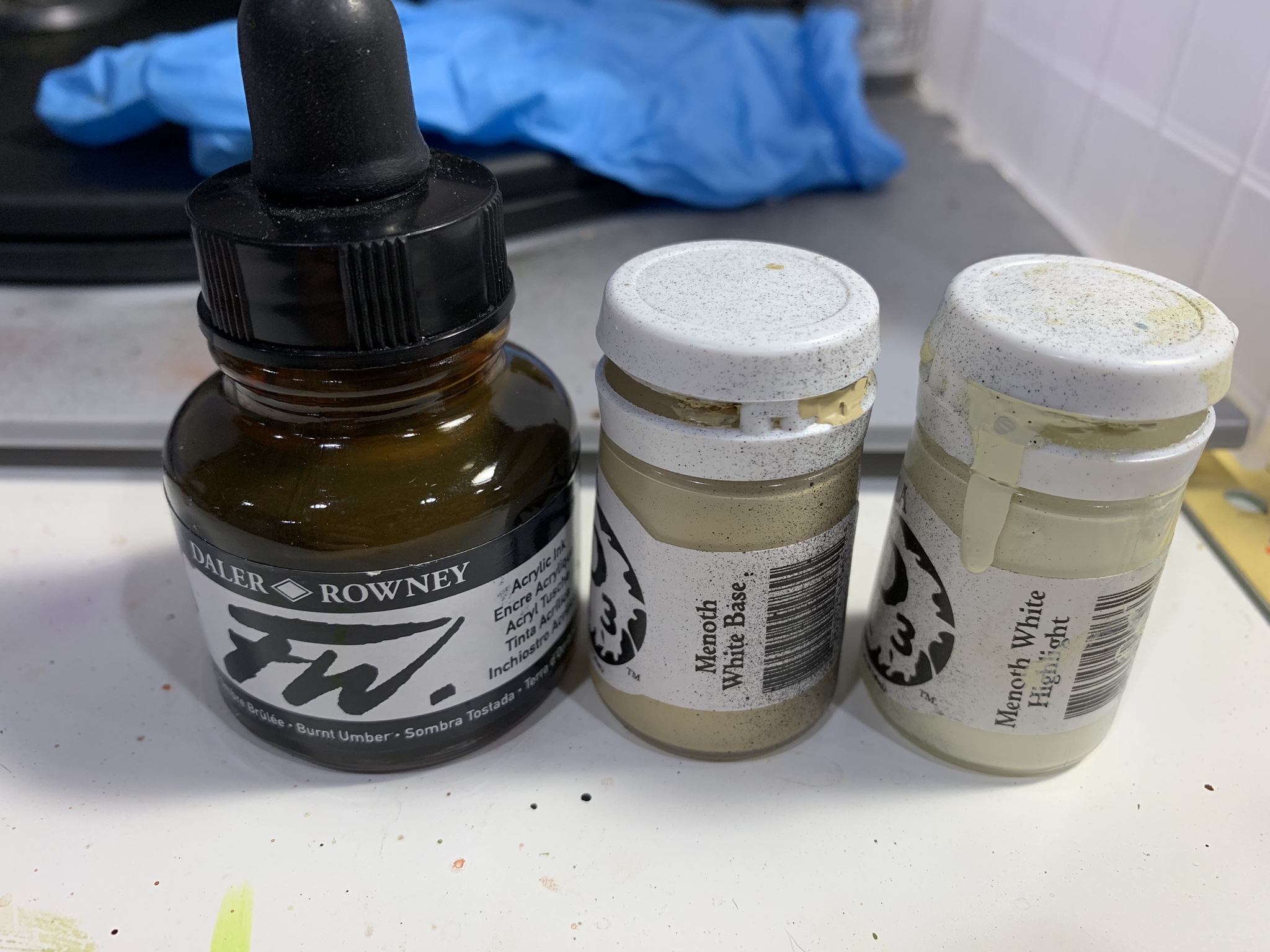 But circling back around to the fact that they’re Death Guard, I wanted them to look worn, dirty, and in general disrepair. They’re not technically daemons, though they do take Chaos marks, so I didn’t want to push the Nurgle Daemon angle with too many buboes and slime. Essentially, I wanted something incredibly worn and dirty and thought that the most obvious way to make them look dirty was to use the off-white 30k colors because it’s easier to make something very close to white look dark and dirty, versus making something darker (40k DG green or even darker) look grimy. At least, that was my train of thought. Lastly, my goal here wasn’t to paint some Crystal Brush-winning model. I wanted to use easy-to-learn, fast-to-apply techniques that, when used appropriately and in conjunction with each other, resulting in a model that, from across the table, makes your opponent go “wow! That’s a cool looking model!” We’ve all seen models that look amazing from 6″ away with staggering detail but I wanted something that looked good from 3′ away. That’s what I set out to do and was my overall goal. Here’s how I did it.