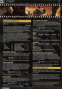 | Space Marine | 1 Infantry | 100 | 5 | 5 | 6 | 6 | 2 | 5 | 3 | 9 | 3+/4++ |