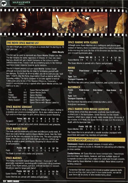 If people want fun. Steve from Miniwargaming and a really cool player who I completely am fluffing the name of do a fun style of movie marines. Where they play giant scenarios and Steve has an army of marines each one is a captain statline. The other guy has sweet ass custom models that they fight against. I recommend it for fun