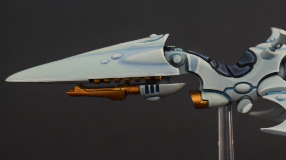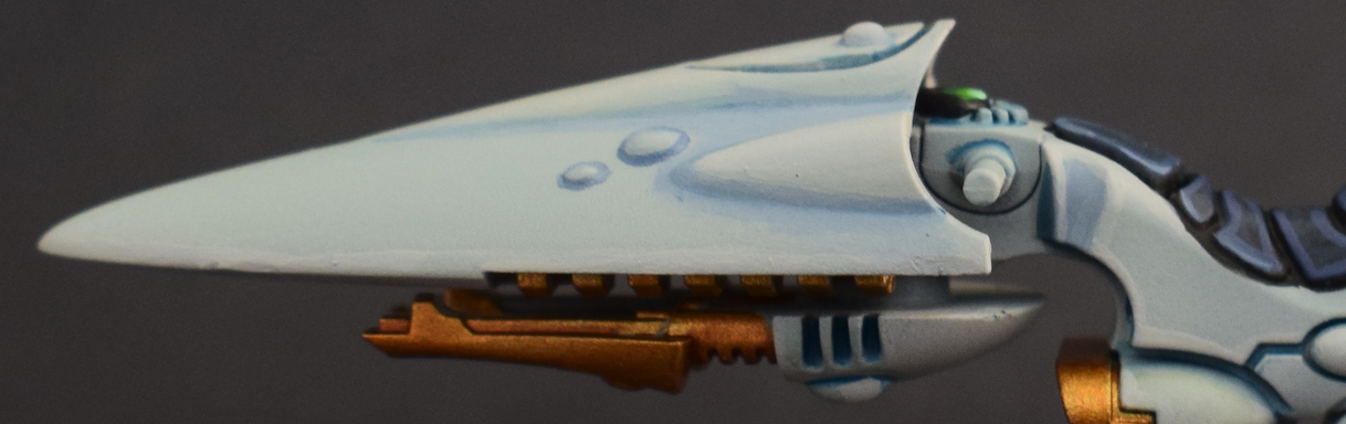 So for doing the shading I hand blended a 50/50 of Russ Grey on the prow of the bike and on the big node just ahead of the bikes exhaust. Other than that I used Nighthaunt Gloom to ring the minor nodes/spirit stones and run between the wing vanes and the hull of the bike. This is a very simple process and I blasted right through it. For those interested the seat is painted Dark Reaper with a Thunderhawk and Fenris Grey for highlights.