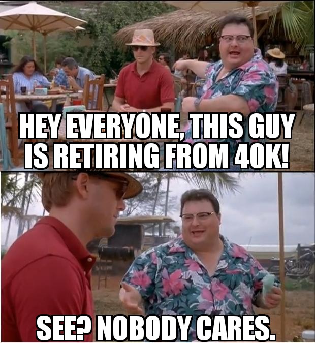 An argument can be made that if someone was heavily into the competitive scene of 40K they might qualify as a “pro” or “celebrity”. If they are planning to step away, you could, by definition, “retire” from the competitive side because athletes do it all the time. The issue with that is that you would have to consider the player an athlete, or a professional. I will just say that most people, including myself, are a long way off from being considered an athlete, or a professional player. Professional athletes who retire, make a living playing that sport. So like I said before, once you’re making money doing something it stops being a hobby and has evolved into a job. Although competitive 40K is getting a lot of traction in recent years, we are still a way off from people being able to make a living off playing 40K while not living with their parents.