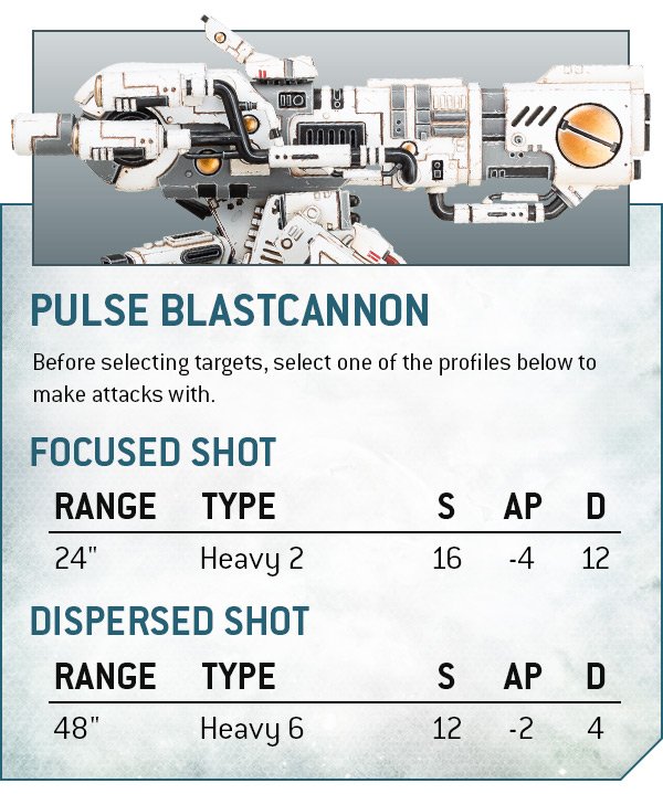 While T’au players will almost always choose the Focused Shot if the weapon is in range, the Dispersed Shot is hardly a poor option. Strength 12 and Damage 4 will do some serious work against most targets.