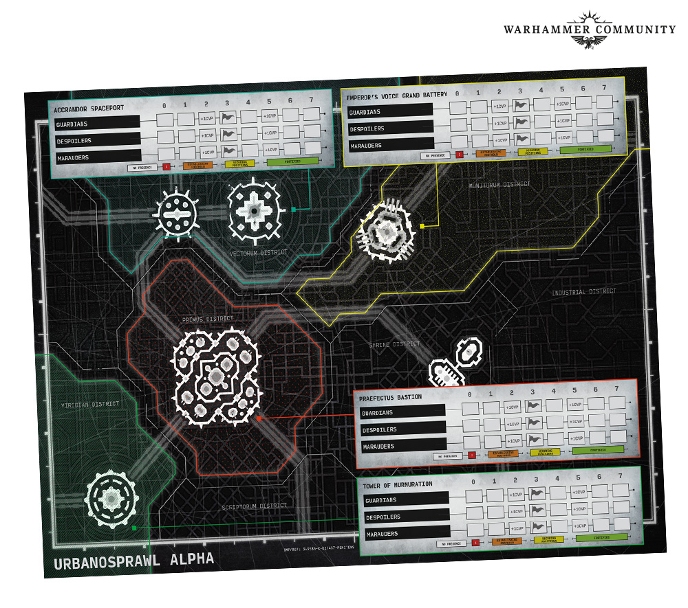 New Campaign Rules and Mechanics: In this supplement, players are split into three factions vying for control of critical sites on Sangua Terra, from Praefectus Bastion to Accrandor Spaceport. Victory points are earned by securing key locations, with the faction controlling the most at the end of the campaign claiming dominance over the region. The rules introduce Epic Hero units with Mighty Champions abilities, granting them immense power. Tactical Reserves and Surgical Deep Strikes add layers of strategy, allowing players to decide when reinforcements will arrive and perform high-risk tactical maneuvers to disrupt the enemy’s lines.
