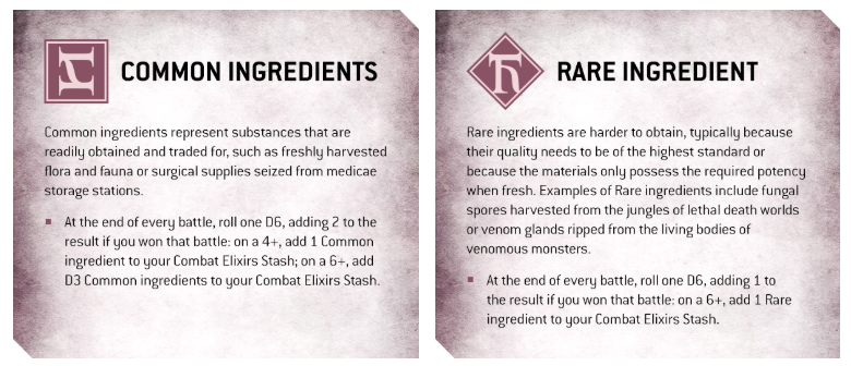 - Common Ingredients: Think of these as the everyday items—fresh flora, fauna, or even supplies “borrowed” from medicae stations. Post-battle, roll a D6 (add 2 if you clinched victory). On a 4+, you snag 1 Common ingredient; roll a 6+, and it’s D3 Common ingredients for your stash.