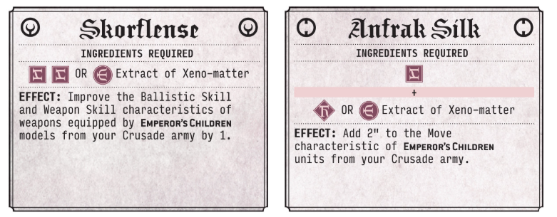 - Army Elixirs: Want your entire force to be sharper and faster? “Skorflense” boosts Weapon and Ballistic Skills, while “Anfrak Silk” adds a swift 2″ to Movement. Imagine the carnage when both are active simultaneously!