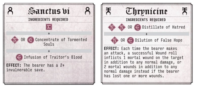 - Personal Elixirs: For your Characters seeking that edge, “Sanctus Vi” grants a formidable 2+ invulnerable save, and “Thrynicine” turns every successful wound roll into additional mortal wounds—double if the bearer has taken damage.