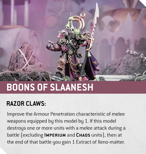 In true Slaaneshi fashion, the Emperor’s Children aren’t just about battlefield prowess—they’re connoisseurs of sensation, always on the lookout for exotic substances to craft their Combat Elixirs. After each battle, there’s a chance to collect ingredients: