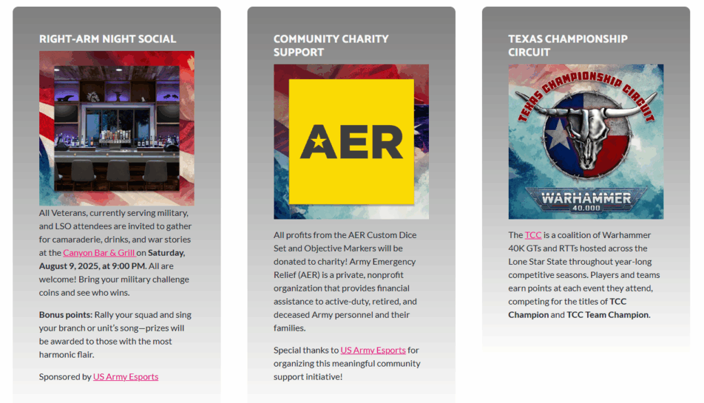 In partnership with US Army Esports, LSO 2025 is also focusing on giving back. All profits from the sale of the AER Custom Dice Set and Objective Markers will be donated to Army Emergency Relief (AER), a nonprofit organization dedicated to providing financial assistance to active-duty, retired, and deceased Army personnel and their families. This initiative allows attendees to support a meaningful cause while enjoying the event.