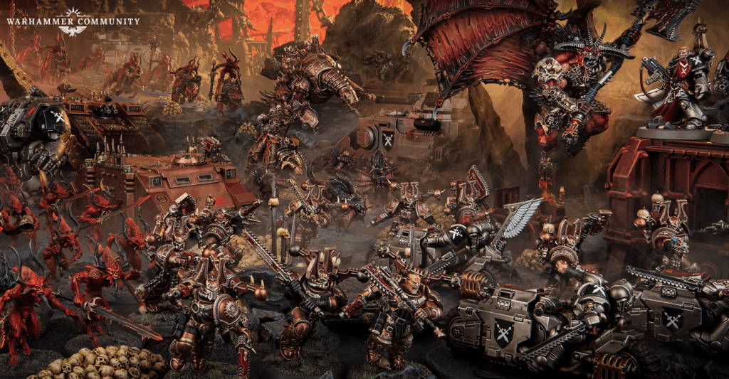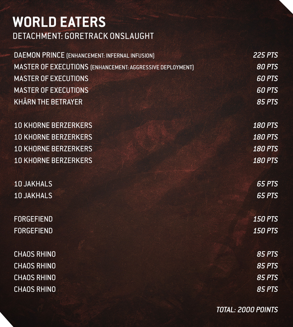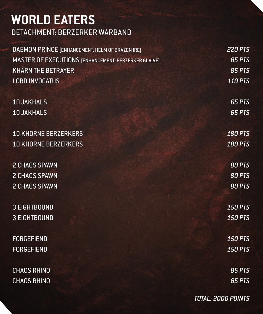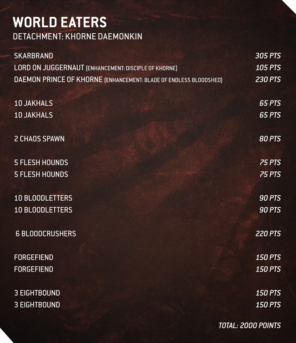 The Khorne Daemonkin detachment introduces the ability to include up to 1,000 points of Blood Legion units in a Strike Force game. This integration brings powerful synergies between World Eaters and Khorne Daemons.