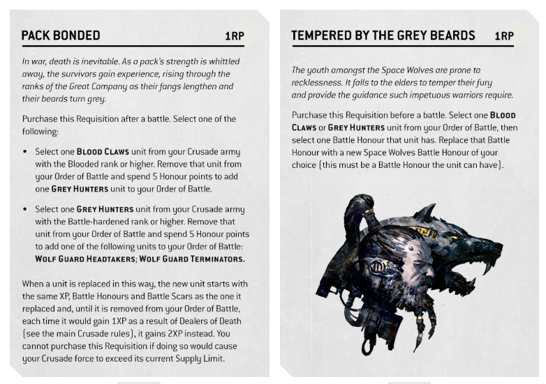 Few things in Crusade are as thematic as watching your warriors grow over time, and the Space Wolves lean fully into that idea with the Pack Bonded and Tempered by the Grey Beards requisitions. After a battle, you can remove a unit of Blood Claws or Grey Hunters and spend Honour points to upgrade them—transforming eager cubs into grizzled Grey Hunters or elite warriors like Wolf Guard Headtakers or Terminators. The best part? Their experience, battle honours, and scars carry over, and they even gain XP faster thanks to their storied lineage.
