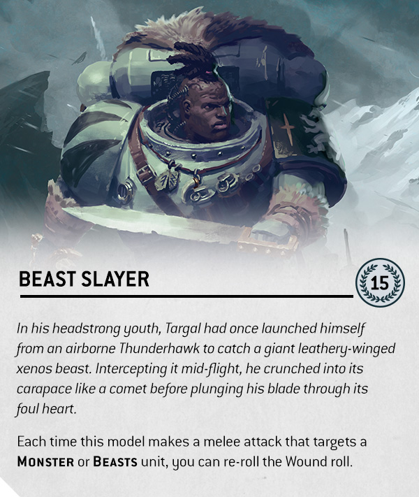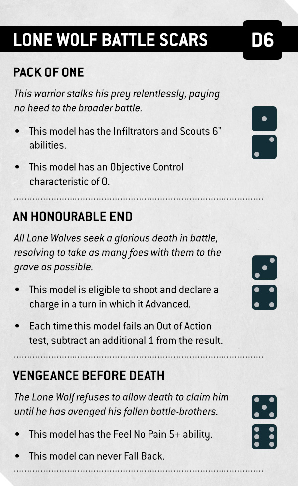 They can become a Pack of One, scouting ahead with infiltration and speed but no Objective Control. They might seek An Honourable End, charging headlong into battle with increased risk but burning intensity. Or they might simply cling to life with Vengeance Before Death, shrugging off wounds with a 5+ Feel No Pain and refusing to retreat no matter what.