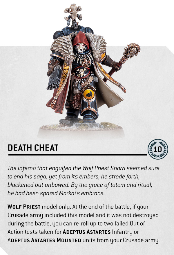 Characters in your Crusade force can go beyond simply climbing the command ladder. They can earn titles and reputations through Deeds of Making. Maybe your Battle Leader took down a Carnifex single-handedly—time to crown him a Beast Slayer, gaining the ability to re-roll wound rolls against Monsters and Beasts. If your dice hate you during Out of Action tests, make your Wolf Priest cheat death itself with the Death Cheat upgrade. As long as he survives, you can re-roll two failed casualty tests for friendly Infantry or Mounted units after a battle.
