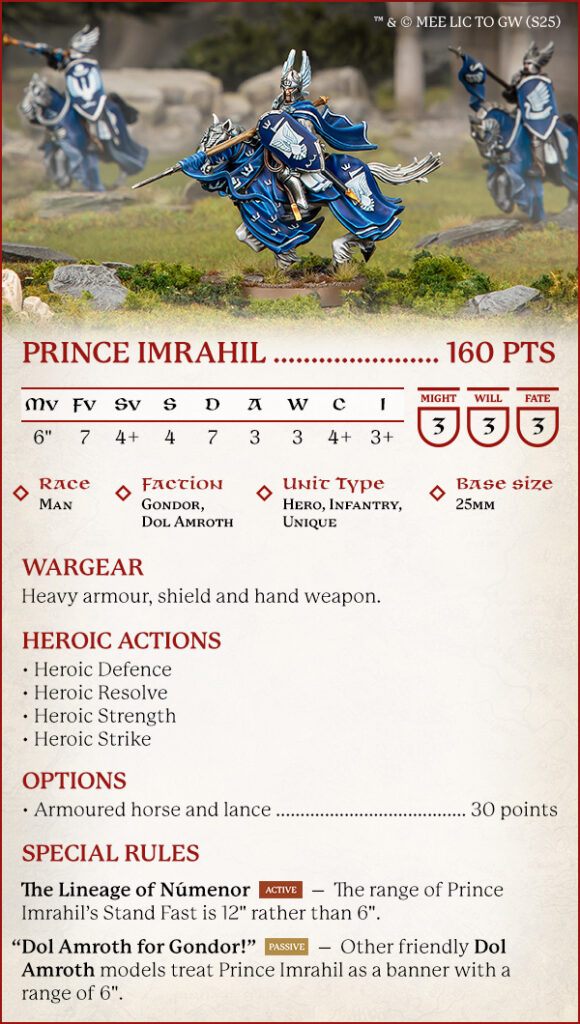 To match his stunning new plastic miniature, Imrahil has been given meaningful boosts on the table. His Fight Value jumps to 7, putting him on par with top-tier heroes like Aragorn and Elrond, making him a true powerhouse in combat. On top of that, his Intelligence 3+ reflects his noble wisdom and lets him breeze through almost any test of wits or tactical insight. Expect him to lead Dol Amroth with both flair and ferocity.