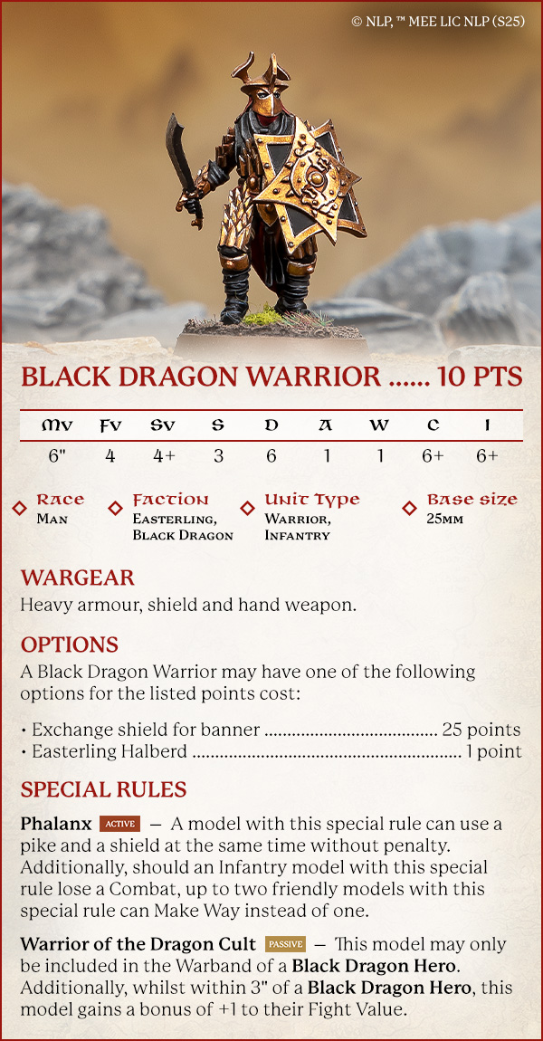 Now with their own distinct profile, Black Dragons are no longer just upgraded Easterling Warriors. They retain the Phalanx rule, can wield Easterling Halberds, and even carry banners. Their Warrior of the Dragon Cult rule requires they be led by a Black Dragon Hero (like Amdûr or the Dragon Emperor), and when within 3” of such a hero, they gain +1 Fight Value, pushing them to Fight 5. This makes them one of the deadliest Easterling infantry options yet.