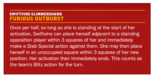 Let’s start small (literally) with Swiftvine Glimmershard, a prickly woodland spite whose infamously explosive debut with the Dar-Ellerath Beechtrees left a pile of bodies in her wake. Whether you call her cute, small, or (heaven forbid) a fairy, Swiftvine reacts with lethal precision, zipping across the pitch to shiv anyone who insults her — sometimes even lunging toward the ball if her mood swings that way. She’s not much for touchdowns, but at 110,000 Gold Pieces, teams in the Halfling Thimble Cup and Elven Kingdoms League can add her sharp attitude (and sharper blades) to their casualty count.