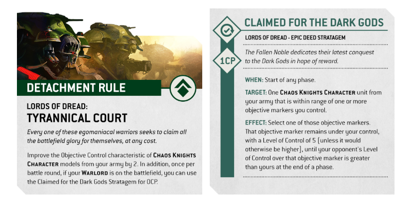 The Lords of Dread Detachment caters to the arrogant titans who scorn their War Dog underlings, focusing purely on the massive Questoris-pattern Knights. With the Tyrannical Court Detachment rule, your Chaos Knights Characters get +2 Objective Control, and once per battle round, if your Warlord is on the field, you can use the Claimed for the Dark Gods Stratagem for free.