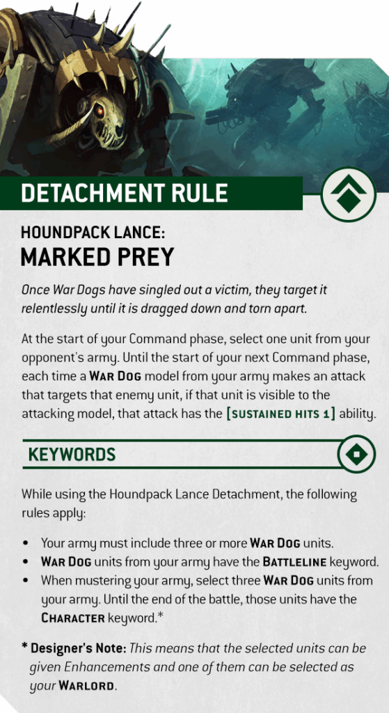 Prefer a War Dog-focused force? The Houndpack Lance lets you field a pure swarm of smaller, vicious machines. Normally, War Dog units can’t be upgraded as Characters — but this Detachment lets you pick three to gain the CHARACTER keyword, letting you apply Enhancements and name one as your Warlord.