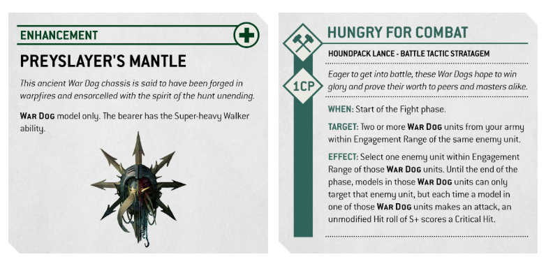 With the Marked Prey rule, you can nominate an enemy unit each Command phase, granting all War Dog attacks against it the [SUSTAINED HITS 1] ability. That’s a lot of extra hits from your fast-moving hunters. One standout Enhancement, Preyslayer’s Mantle, gives a War Dog the Super-heavy Walker ability, letting it crash through enemy units without being slowed. And when you’ve got two or more War Dogs ganging up on a foe, the Hungry for Combat Stratagem ensures any unmodified 5+ hit rolls score critical hits — unleashing a brutal flurry of attacks.