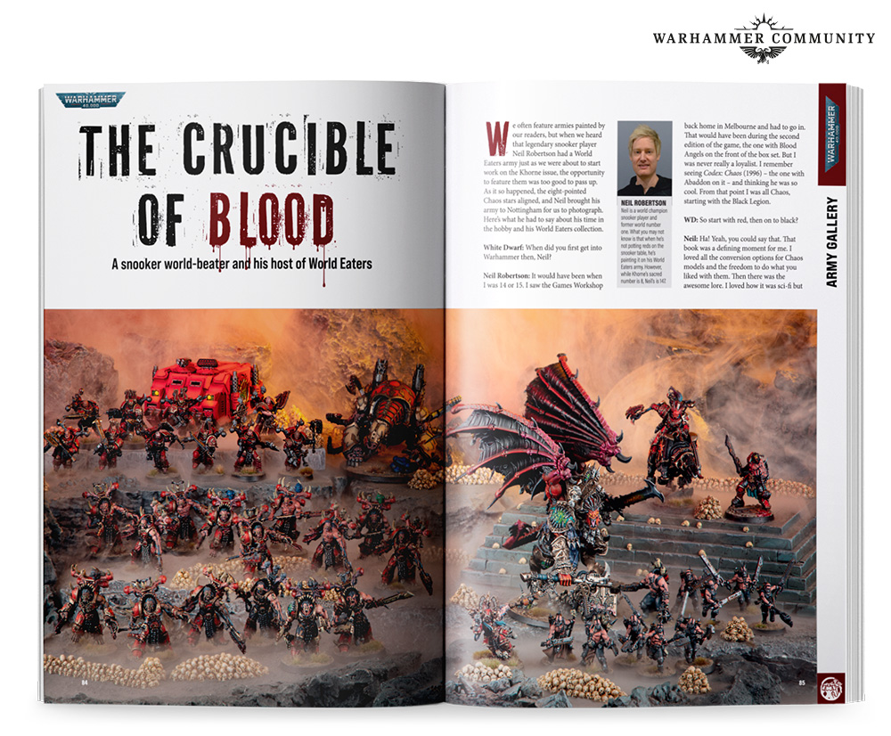 The White Dwarf team ransacks the vaults of the Grey Knights to dig up every scrap of intelligence they’ve gathered on Khorne and his followers — all marked out in their bloodiest red ink. Two stunning army displays await: one showcasing the Warhammer 40,000 World Eaters collection by legendary snooker player Neil Robertson, and the other featuring a Horus Heresy-era Khorne force assembled by the Warhammer Studio’s Luke.