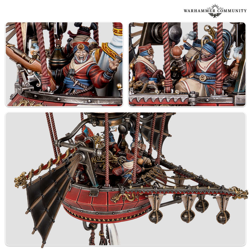 Rather than just plonk four Crane Gunners in a floating box, the crew was made into a scrappy, skyfaring bunch—eclectic, a bit pirate-y, and totally Warhammer. The gondola is packed with flavor: there’s even a Lord Magistrate sipping tea mid-battle, and a peg-legged Champion hurling bombs like he’s in Guns of Navarone.