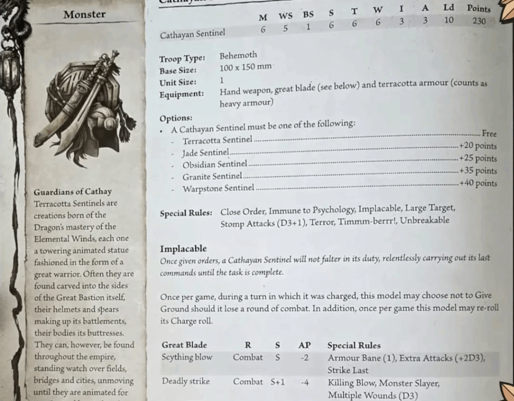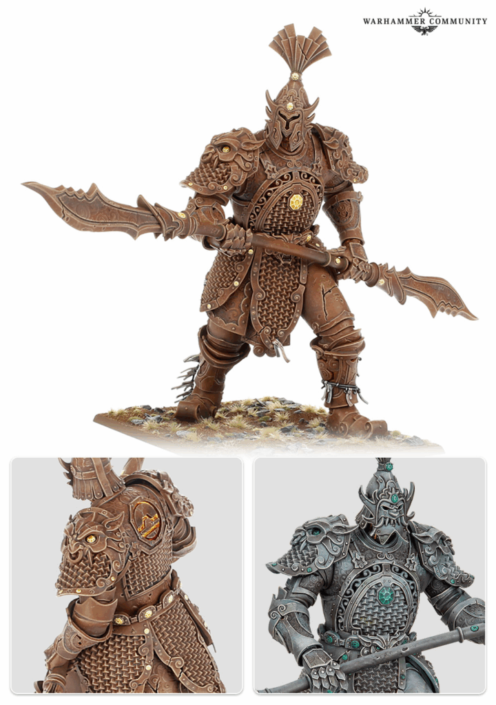 Alright, this thing is a massive animated statue, basically a Terracotta Warrior with a severe anger management problem. The designers nailed the sense of weight, layering all the iconic Cathayan armour types into a single kit. It’s complex, but it’s also coherent.